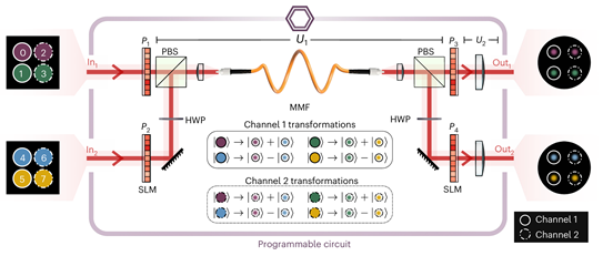 研究團(tuán)隊(duì)的核心創(chuàng)新在于構(gòu)建了一種可編程8×8維多端口量子光學(xué)電路,該電路利用多模光纖內(nèi)部天然存在的復(fù)雜模式混合過(guò)程作為高維幺正變換載體,并在其前后引入四個(gè)可編程相位平面,實(shí)現(xiàn)對(duì)兩個(gè)獨(dú)立光子、八個(gè)橫向空間模式的按需操控。